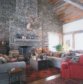 South of New England in Appalachia, settlers built homes of squared logs. They also built furniture and wove textiles. The Appalachian-style log cabin embodies American country. Here you'll find rocking chairs on shed-roofed porches, wooden beds layered with scrap quilts, and open stone hearths filled with cast-iron kettles for cooking.