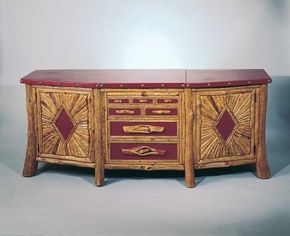 Many dude ranches were spruced up for their city slicker patrons. The person who created what is termed Cowboy High Style was Thomas Molesworth, a furniture maker from Cody, Wyoming, who accepted several commissions to furnish Western ranches and hotels. His furnishings depict the Western lifestyle in romanticized glory. He peeled and polished fir and lodgepole pine branches to frame his furniture and upholstered the pieces in brightly colored leather or Chimayo weavings.