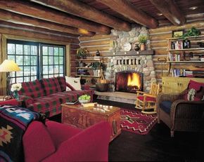 Today, ranch-style log cabins endure as American icons. With a stone fireplace or an iron woodstove at its center, the cabin on the ranch is casual and utilitarian. Navajo rugs or cowhides might gussy up the wide-planked wood floors. The furnishings are oversized and comfortable, with a rocking chair stationed at the hearth and leather armchairs and sofas nearby for relaxing after a day of riding the range.