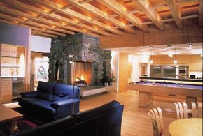 Lighting can also add contemporary flair. Recessed lights, track lighting, and tapered torchères add drama to the space as they spotlight log trusses and ceiling beams. In the kitchen, stainless-steel appliances reinforce contemporary style. The primary colors of a Mondrian painting or a wash of neutrals all carry the look, and accessories are carefully edited.