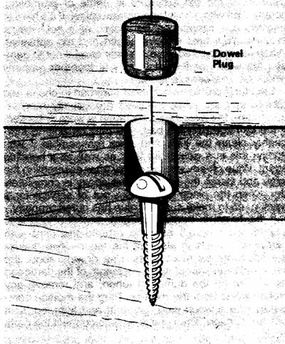 Screws and glue: If a loose joint would be difficult to take apart, you may be able to solve the problem with a long screw. First align the joint and drill a pilot hole for the screw. Then enlarge the top of the pilot hole so that a small piece of dowel can be installed over the screw head. Coat the screw with glue, and drive it into the joint so that it pulls the joint tightly together. Before you tighten the screw, try to force adhesive into the loose joint; this will help strengthen the joint. Then tighten the screw firmly.