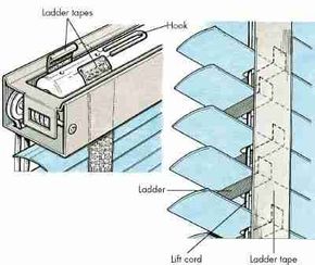 Step 3: Pull out hooks that hold tapes in place at the top of blind. (One hook holds tapes on each side.) Position new tapes in top box and slide hook into each pair of tapes, front and back, at sides of box. Slide slats into place between tapes; make sure they're all right side up, facing the right way. Fold ends of tapes under, and fasten them to bottom rail under last slat.
