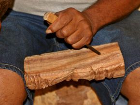 A master wood carver creates a monkeypod wood tiki on the island of Maui in Hawaii.