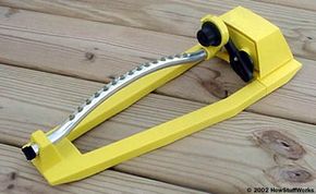 An oscillating sprinkler like the one shown above is one of the most common sprinklers around. It sprays out a fan-shaped curtain of water, and the metal arm oscillates back and forth to cover a rectangular area perhaps 20 feet by 30 feet (6 meters by 9 meters) in size.